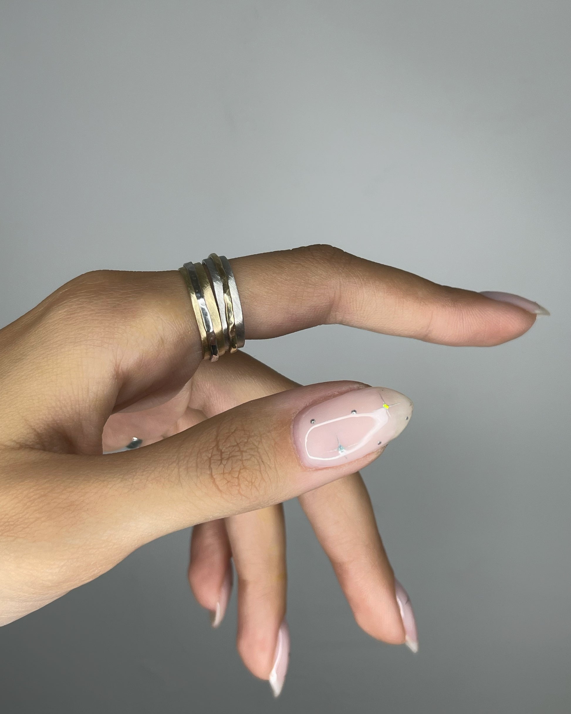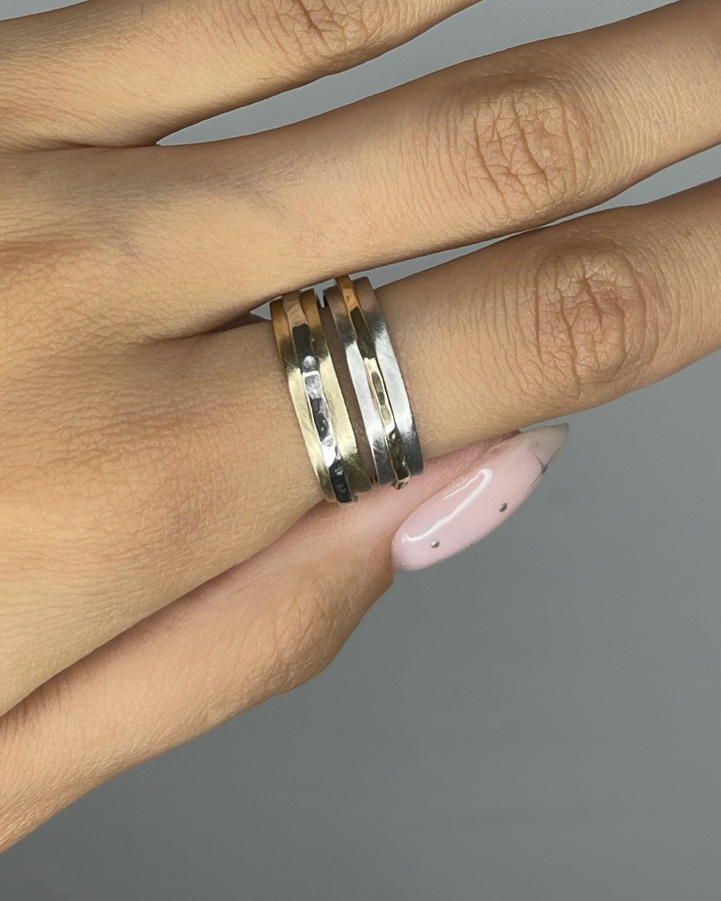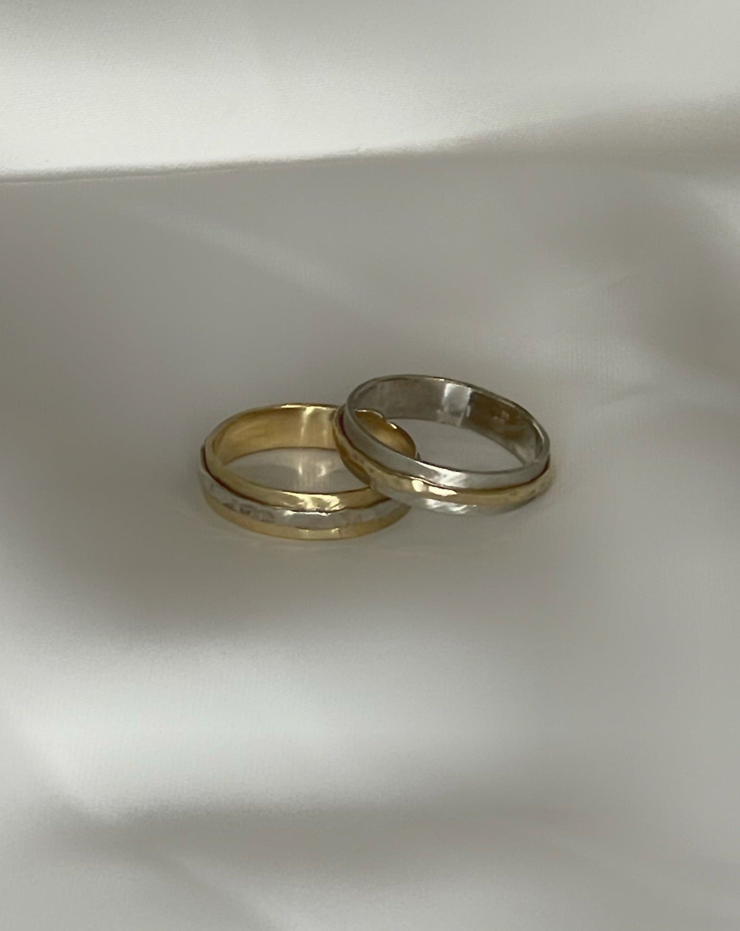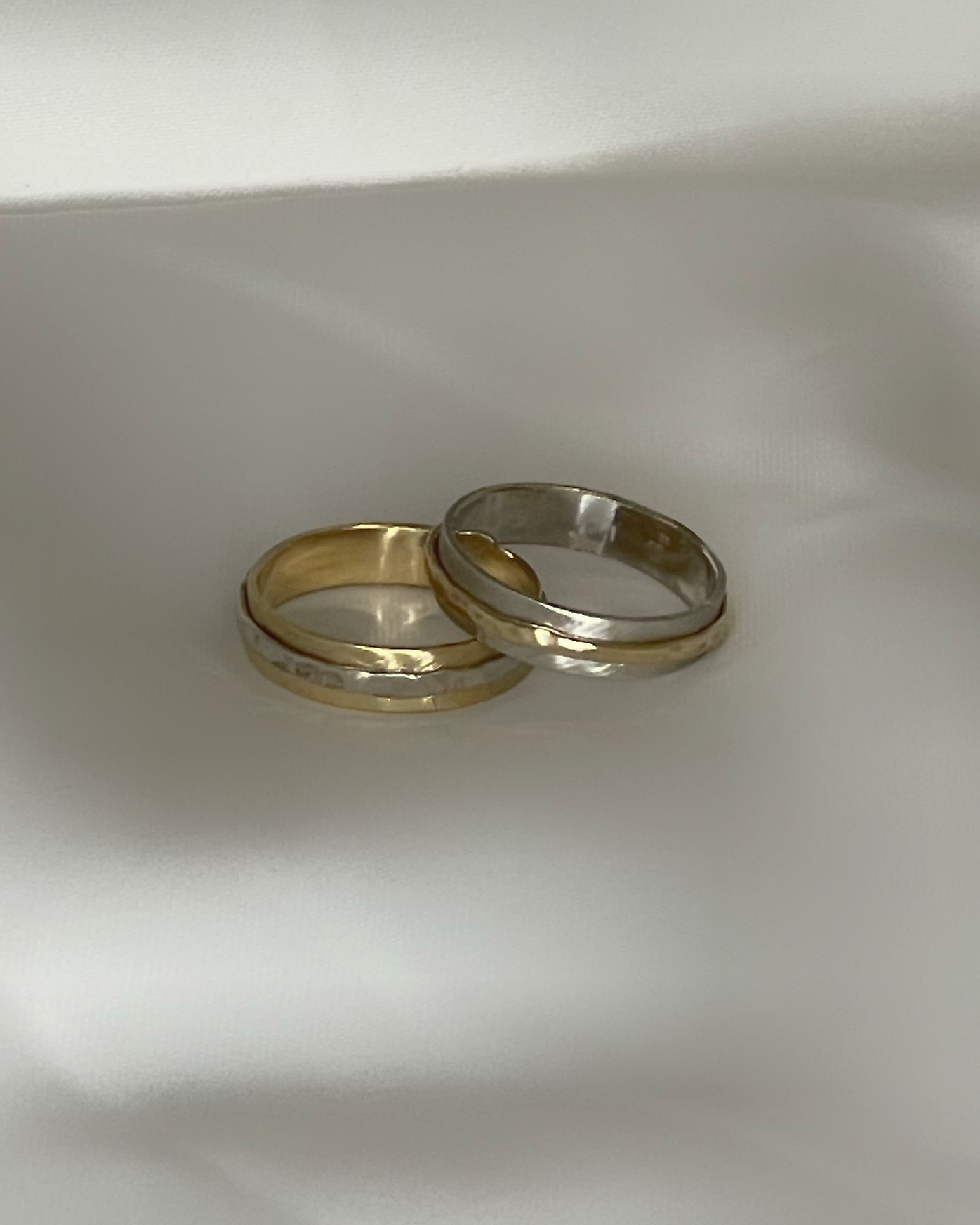 'עזר כנגדו' - טבעת נישואין המורכבת מ-2 טבעות בעיצוב ייחודי. הטבעת מורכבת מטבעת בסיס בעיצוב מט ומעליה טבעת זהב דקה בעיצוב מרוקע ומבריק. היופי בעיצוב 'עזר כנגדו' הוא ההרמוניה שנוצרת מהניגודיות של צבעי הזהב, בשילוב הניגודיות של העיצוב המבריק והמט