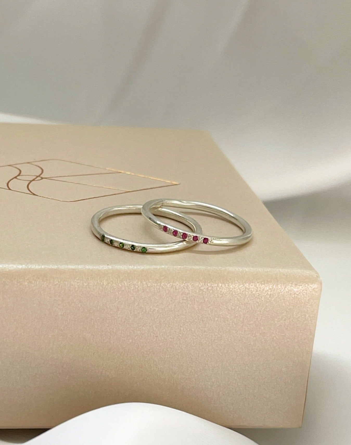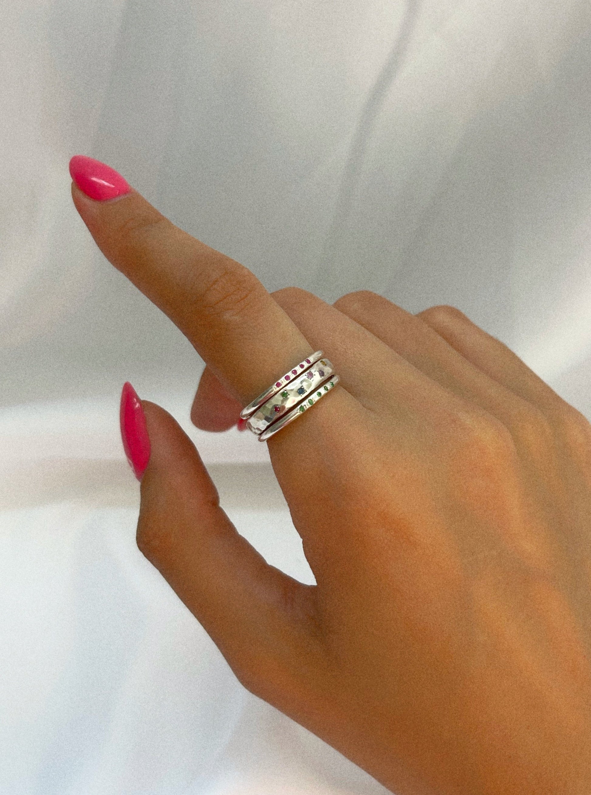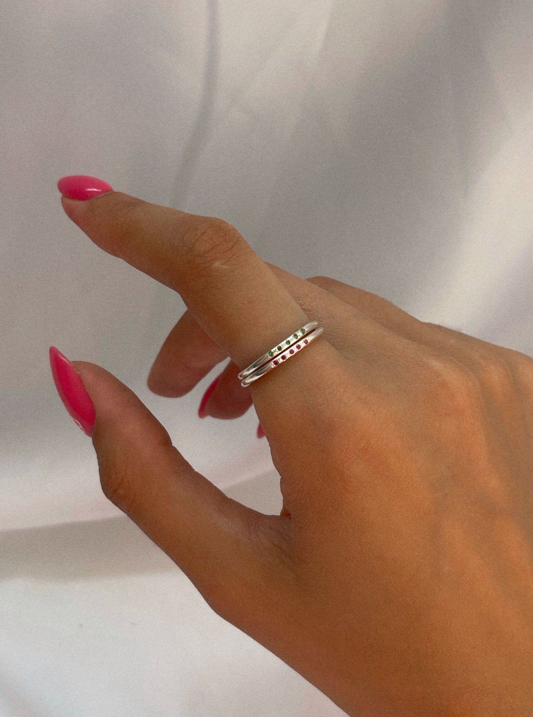 טבעת מיליה היא הנסיכה העדינה של הקולקצייה. הטבעות עדינות עם טאץ׳ צבעוני ומיוחד. כל טבעת משובצת חמישיית אבני רובי / אמרלד טבעיות ויפייפיות לבחירתכם