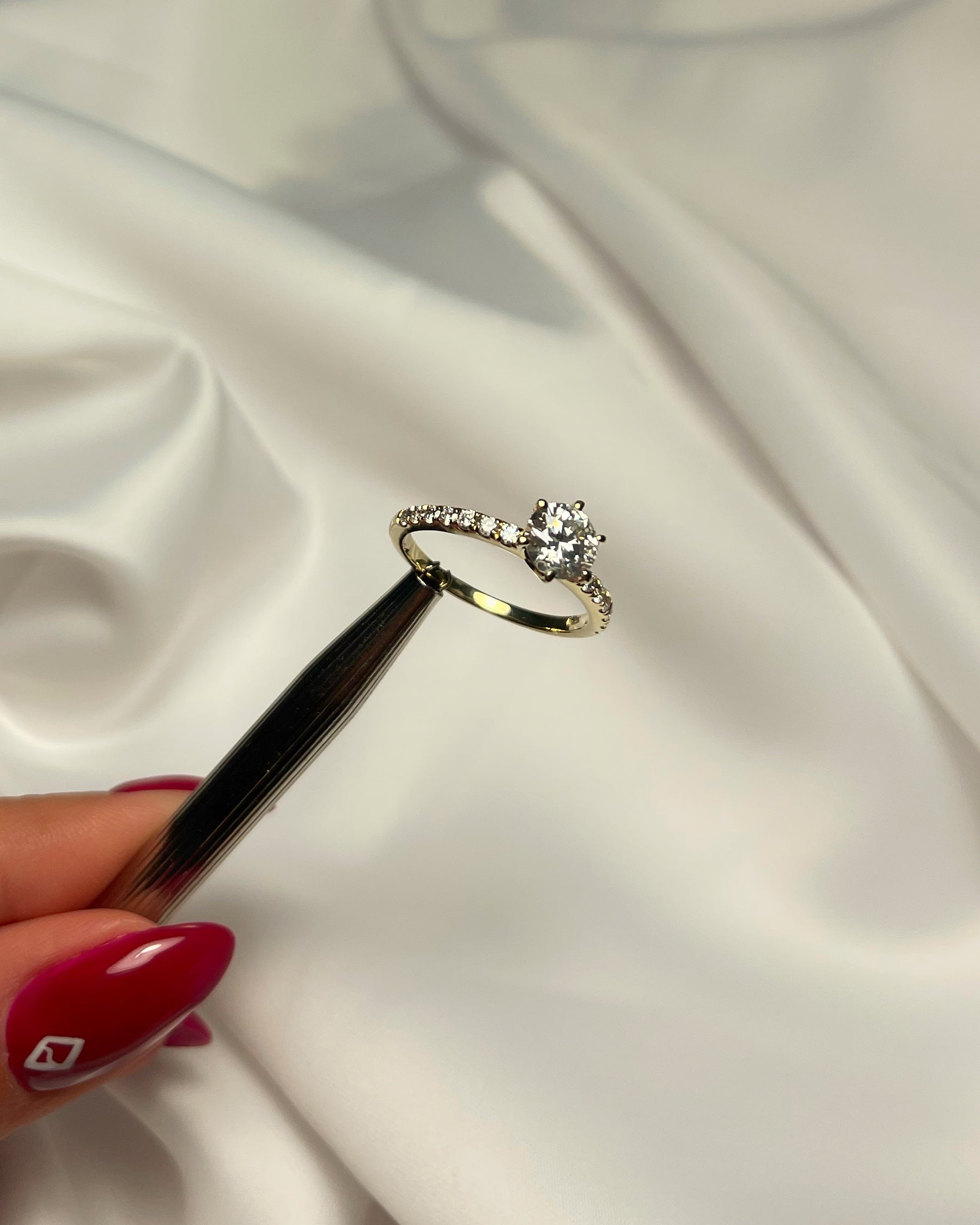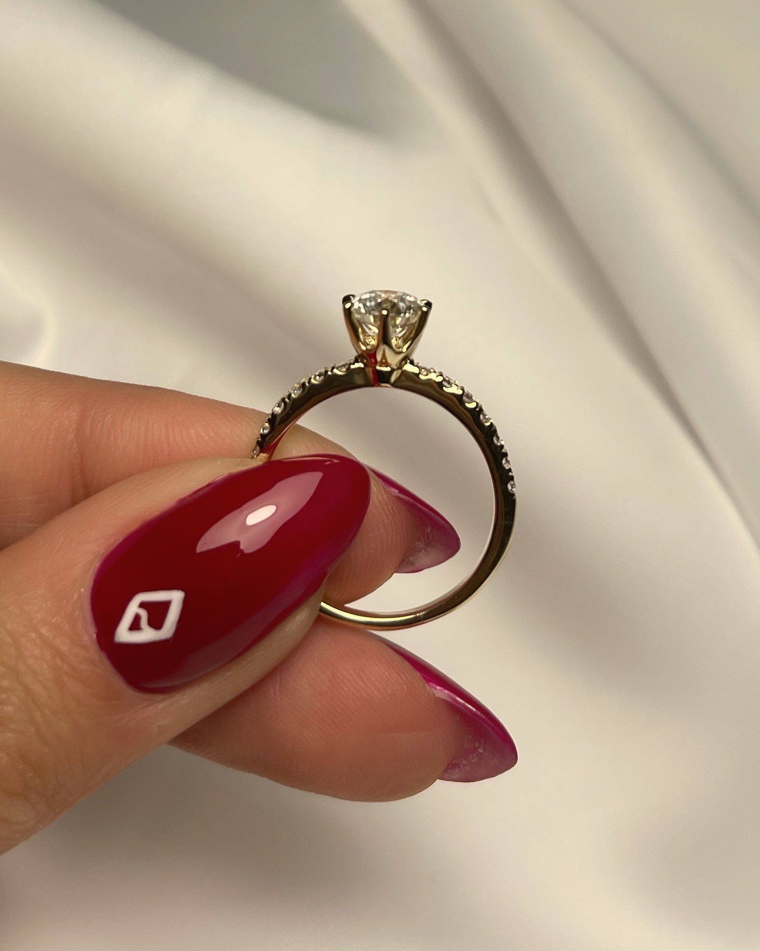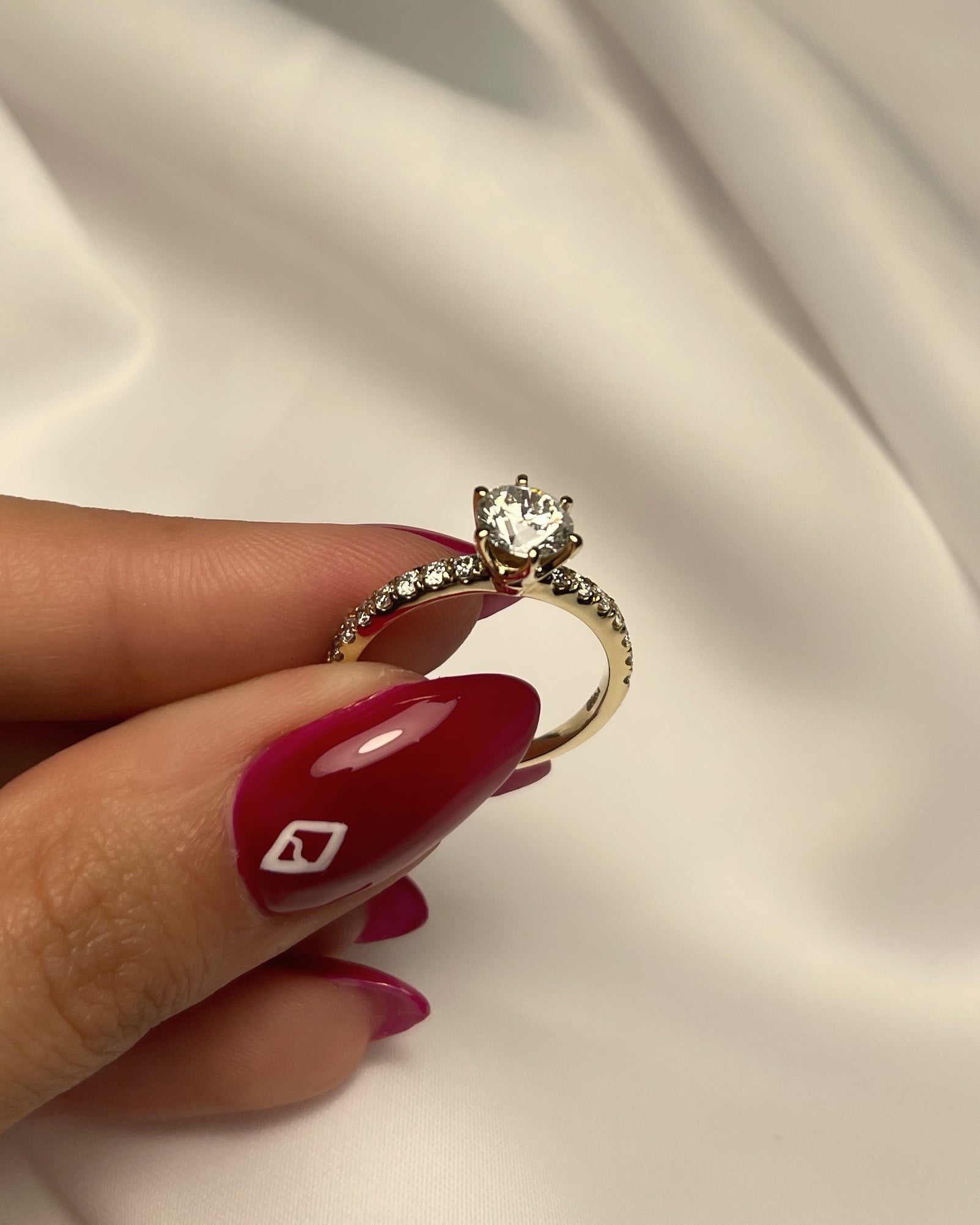 טבעת זהב עבה שבמרכזה יהלום טבעי משובץ בעיצוב כתר מיוחד מאוד, משובצת ביהלומים לאורך צידיה. היהלום המרכזי הוא יהלום טבעי במשקל 1 קראט, עם 0.35 קראט יהלומים נוספים. 1.35 קראט יהלומים טבעיים טוטאל