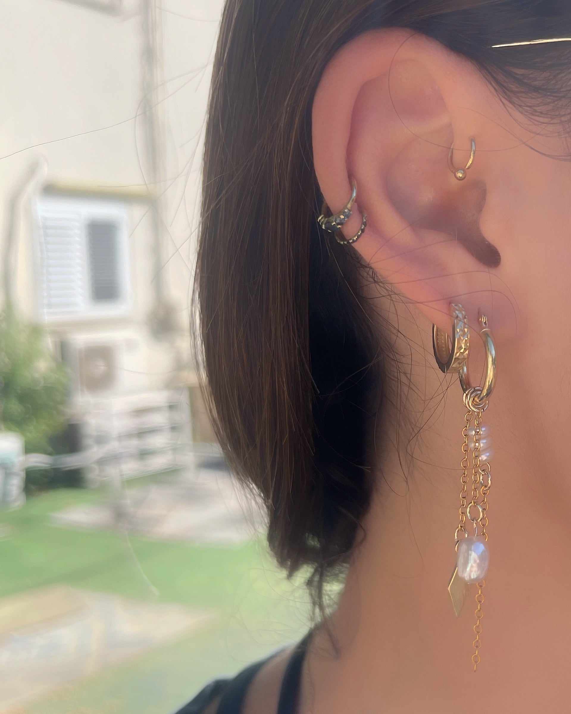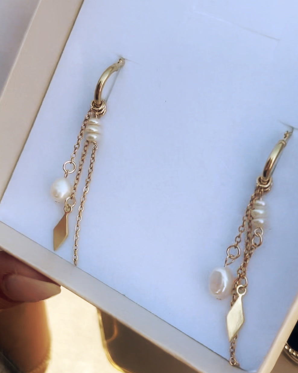 עגילי ליאן הם עגילים של אהבה ממבט ראשון. עגילים עדינים עם שרשראות כסף נשפכות בשילוב פנינים עדינות ותליון מיני עדן מיה