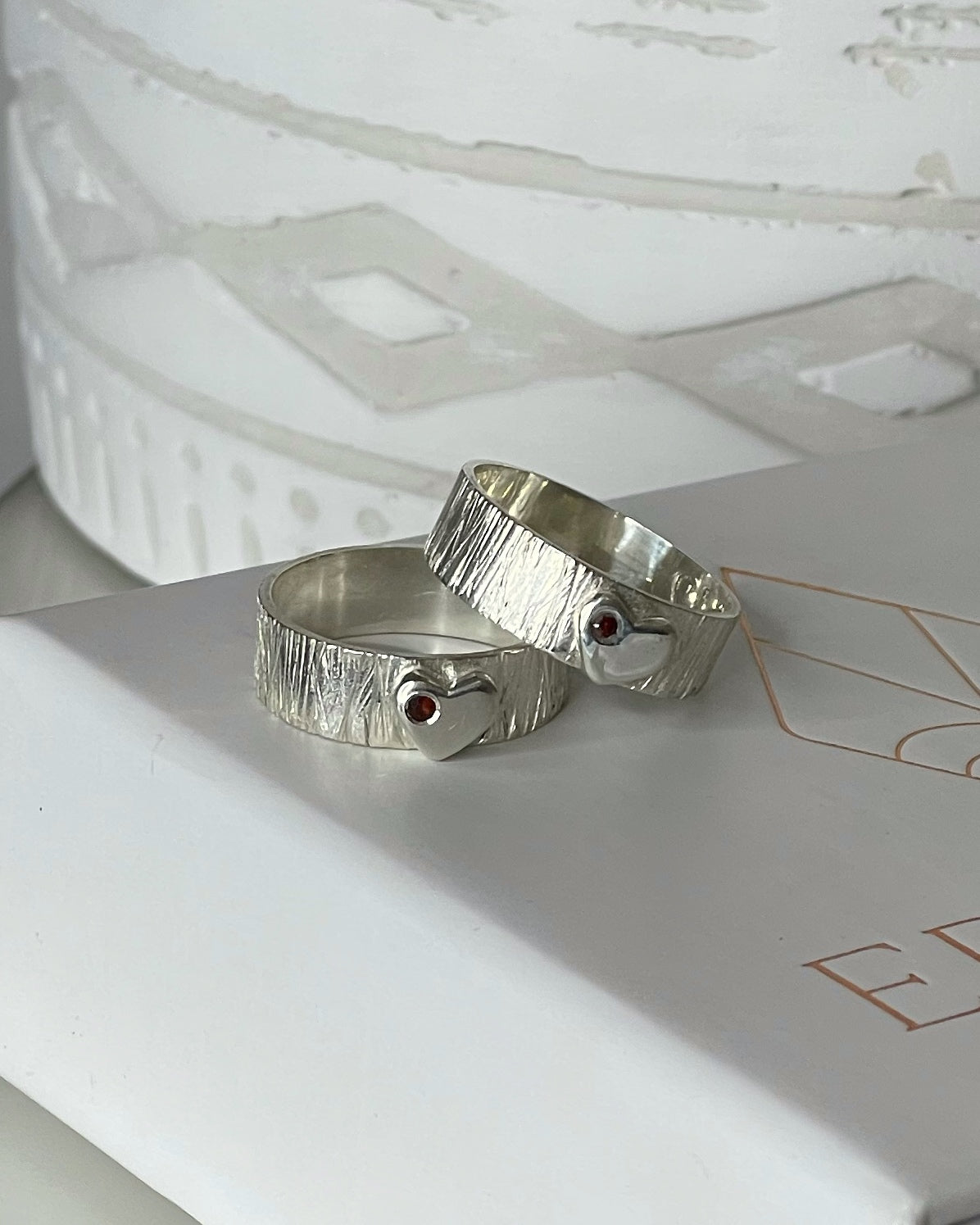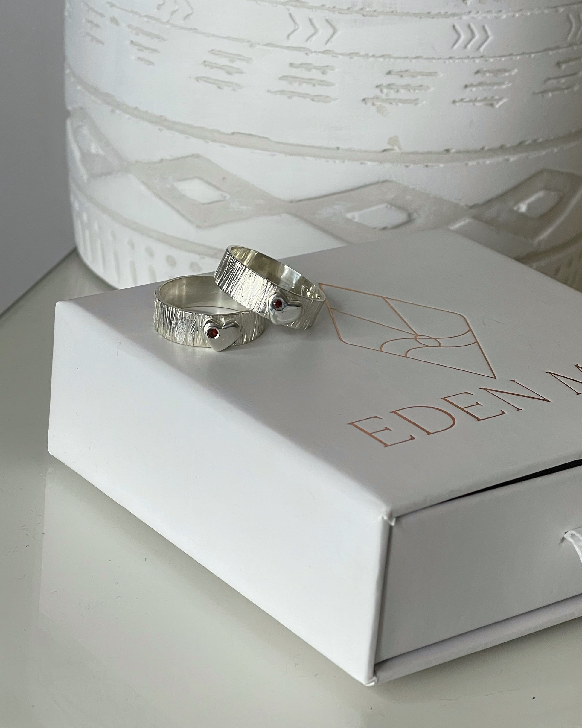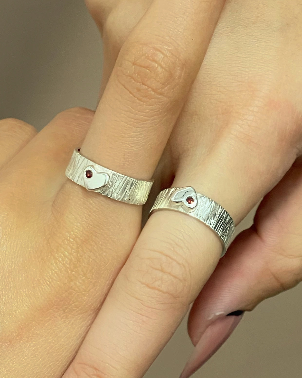 טבעת שובל עשויה מלב יצוק מבריק מעל טבעת מחוספסת שעשויים בעבודת יד, ובצד הלב אבן גרנט טבעית משובצת.